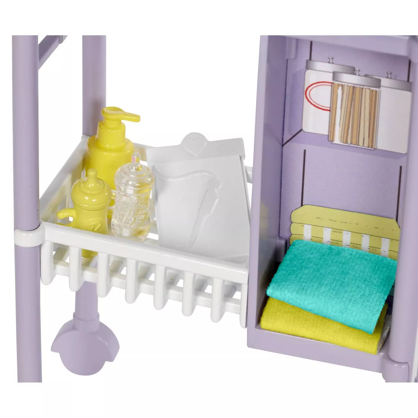 • Toy play items include an examination table with lotion bottle and other accessories, overhead mobile and clear compartments for the 2 baby doll patients!